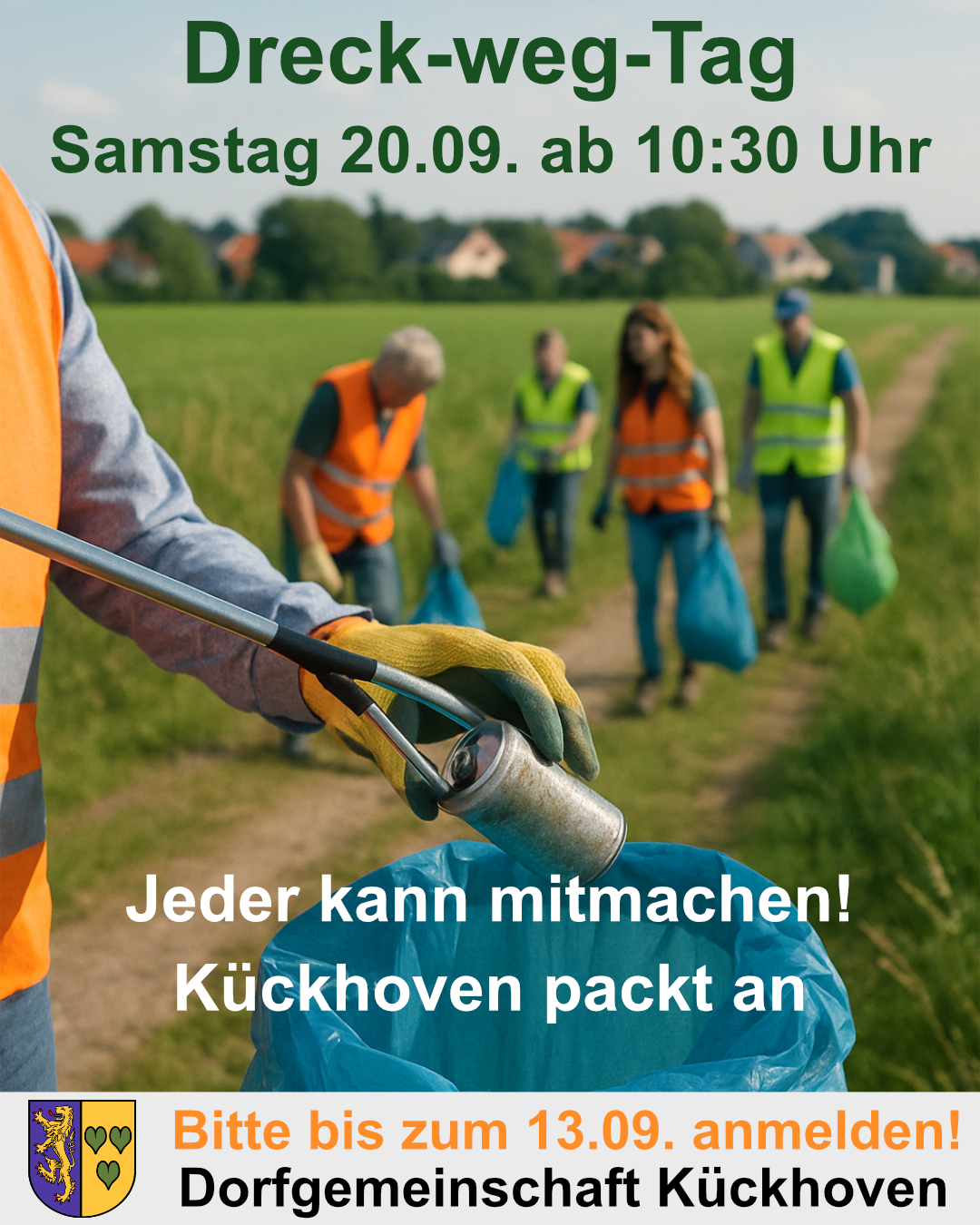 Gemeinsam für ein sauberes Kückhoven – wir räumen auf! 🧹🌍 Am Samstag, 20. September 2025, beteiligt sich die Dorfgemeinschaft Kückhoven e.V. am weltweiten Dreck-weg-Tag. ♻️ Dafür brauchen wir helfende Hände – groß, klein, jung, alt: Jede*r ist willkommen! 🙌👧👦👵👴 📅 Wann? Samstag, 20.09.2025 ⏰ Startzeit: 10:30 Uhr 📍 Treffpunkt: Roter Platz hinter der Kirche 🕑 […]